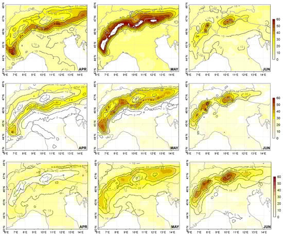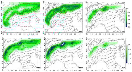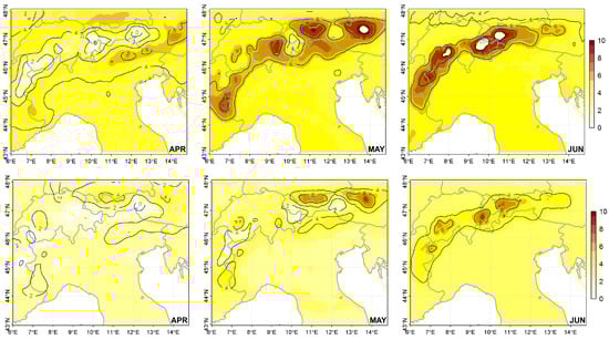 We can directly relate this characteristic behavior of ST to the changes in snow cover and depth in FC. Figure 6 depicts the differences in snow cover and depth between FC and RC. With regard to snow cover, in April, the off-alpine areas (i.e., middle-slope and/or foot) are affected by a large snow cover deficit; in May the largest snow cover deficit extends to the areas near the mountain peaks, whereas in June it appears only over the highest peaks. The lack of snow cover in these months justifies the ST differences (see Figure 5) and is consistent with the flux distribution observed in high mountains (see Figure 3), thus indicating the earlier seasonal growth of NR, SHF, and LHF by about one month in FC, due to the earlier snowmelt (with values close or even larger than 2 m in April and May). It is noteworthy that these features appear more prominently on the Southern and Eastern sides of the Alps, implying the potential for the most serious snow cover deficit in FCs in those areas. As far as snow depth is concerned, the areas of larger snow depth deficit shift to the north with the maximum in the Northern parts of the Alps, mostly ranging over France, Switzerland, and Austria in both April and May. Note that far more glaciers are spread over the Northern slopes than over the Southern sides of the Alps due to the year-round higher amount of solar radiation in the south and the larger accumulation of snow via wintertime humid air transport to the north. This implies the acceleration of melting and retreat of the Alpine glaciers in the Northern sectors of the Alps in FCs. The snow depth deficits tend to decrease approaching June because snow in FC has already disappeared by that time.