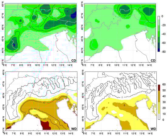 Figure 8 shows the annual number of cold and warm days, expressed as the average number of anomalies between FC and RC and between FC and RC. Again FC shows a smaller number of cold/warm days than, but similar distribution with, FC. For the cold days (CDs), the anomaly is generally negative in the Alpine areas, implying a decrease in the number of CDs in FCs. This feature is particularly evident on the mountainous grid points and is more prominent over the Northern sides. Actually, in the RC, the grid points with more than 150 CDs occupy a large fraction of the Alps, while in FCs, these appear only in some limited areas around mountain peaks (not shown). In the plain areas, CDs almost disappear in FCs—the absolute number of the CD anomaly between FC and RC is mostly lower than 20. This tendency is quite affirmative because the interannual variability in the number of CDs decreases (not shown). As a result, some small areas in which the number of CDs in FC decrease by 80 or more are present in the extreme Southwestern Alps between France and Italy and in Slovenia, whereas the off-alpine areas in Northeastern Italy show deficits of about 60 days. In FC, similar features appear but with smaller values (deficit of 30 in Slovenia and 20 in the Southwestern Alps. For the warm days (WDs), positive increments are prevalent over the plain Po Valley areas, as expected; hence, there is an increase in the number of WDs in FCs. In some zones (e.g., the coastal region of Tuscany), the anomaly exceeds 40 days, which implies that the average summer in FC will be hotter than the summer of 2003 that had an unprecedentedly strong heat wave in Europe [60]. Furthermore, the anomaly in the interannual variability of the number of WD doubles (not shown)—indicating the possibility of very long and intense heat waves that would exert wide negative impacts on the environment, human health, and agricultural production. In FC, areas of about 40 increment in WDs are present over the plain Po Valley, the coastal region of Tuscany, and some spots in the Piemonte region.
