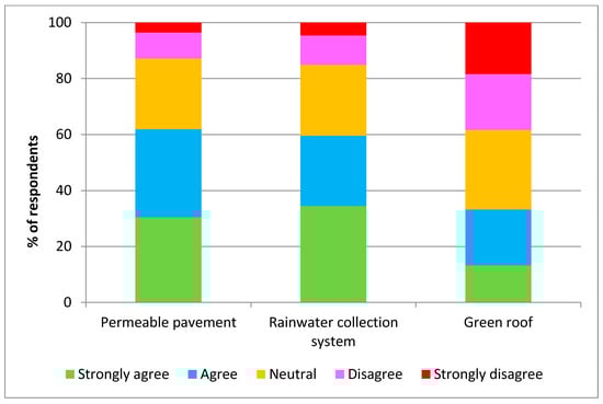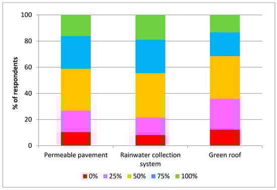 The survey included short descriptions, pictures, and estimated costs of the three selected household-level measures. The cost of each individual measure was estimated through literature research as well as consultation and personal communication with local suppliers and developers. An approximate cost of €250 per m2 was estimated for the permeable pavements. The system would include gravel pavers and a 25-cm aggregate base [,]. The costs for a rainwater harvesting system includes gutters, mesh screens, pipes, pumps, pressure tanks, filtering, disinfection, and a 10-m3 storage tank, which were estimated to add up to €4000 [,]. Costs for installing green roofs differ depending on the type of materials used for the drainage, the filter layer, the substrate type and depth, and the plant species used. An estimated cost of €200 per m2 for a green roof system that would include an insulation mat, a drainage layer, filter sheet, 25-cm substrate layer, plants, and an irrigation system was established with the help of a local green roof expert [].
