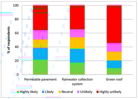 From the 391 respondents, 61% had a house or planned on building one in the near future. Figure 4 presents the likelihood of respondents implementing the three-household measures. There was no statistically significant relation between respondents who lived in an area affected by floods and their willingness to implement the measures. However, our analysis revealed a statistically significant relationship between people concerned about flooding and their willingness to implement rainwater harvesting systems (p = 0.075). As pointed out by a number of respondents, “the rainwater harvesting system is much simpler to install than the other two measures” since it does not require removing or enhancing the infrastructure of the house. In this case, simplicity to install, low cost, and additional benefits to homeowners may be important elements for examining to make such measures appealing to individuals.