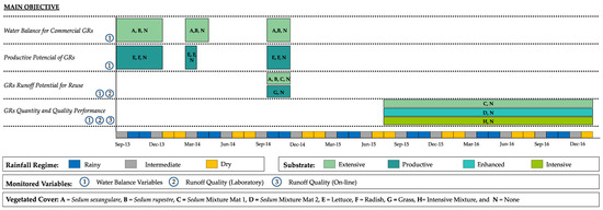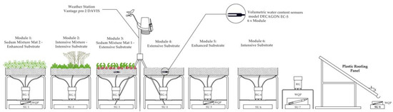 GR runoff quantity was monitored using tipping bucket rain gauges with a sampling rate of one minute and 0.1-mm resolution (DAVIS model rain collector II). Rainfall was measured with a sampling rate of one second and 0.2-mm resolution, using an ISCO tipping bucket rain gauge. In order to capture the experimental on-site hydrologic conditions, temperature and humidity were measured using a sampling rate of 1 min, by means of a DAVIS weather station model VANTAGE Pro 2. The schematic representation of the assembly of different GR modules during one of the monitoring periods is shown in Figure 3.