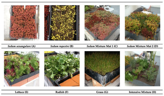 (A) Homogeneous configuration of Sedum sexangulare; (B) Homogeneous configuration of Sedum rupestre; (C) Heterogeneous Sedum mixtures (Sedum Mixture Mat 1: sexangulare, chatre, album, acre, and kamtschaticum; (D) Heterogeneous Sedum mixtures (Sedum Mixture Mat 2: blue, acre, fino, sexangulare, chatre and oregano); (E) Homogeneous configuration of Lactuca sativa (lettuce); (F) Homogeneous configuration of Raphanus sativus (radish); (G) Homogeneous configuration of grass; and (H) Heterogeneous mixture of Dietes iridioides (water lily), Bergenia cordifolia (bergenia) and Lavanda dentate (lavender) (Intensive Mixture).