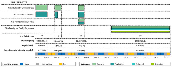 As mentioned, rainfall conditions in Bogotá follow a bimodal pattern, seeing annually two rainy and two dry seasons of two months each [34]. Based on this pattern, each rainfall event was classified either as occurring during a rainy, dry or intermediate period. These three periods of four months each were defined in order to evaluate their retention on GR modules. The months corresponding to the rainy period are April, May, October, and November. Dry period months include January, February, July, and August. The rest of the months (March, June, September, and December) correspond to the intermediate period.