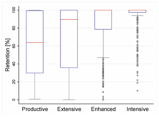 The Intensive Substrate had the best performance, with statistically significant differences from the Extensive Substrate (p-value = 0.000), Enhanced Substrate (p-value = 0.000), and Productive Substrate (p-value = 0.000). The Enhanced Substrate had higher retention efficiency than Extensive Substrate with statistically significant differences (p-value = 0.003). The Productive Substrate showed the lowest average retention efficiency, with statistically significant differences compared to the Enhanced Substrate (p-value = 0.000) but not to the Extensive Substrate (p-value = 0.789).