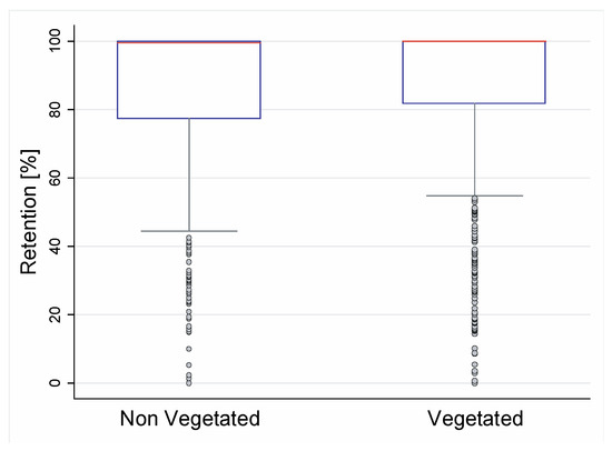 In order to establish the effect of vegetation on retention of storm water runoff, an analysis comparing vegetated and non-vegetated modules was performed (regardless of the type of substrate). Figure 6 presents the box and whisker diagram for the vegetated and non-vegetated modules for all types of GR substrates that were monitored in this study. It is possible to identify similarities between the retention efficiencies for vegetated (85.65%) and non-vegetated (84.76%) modules. The results of the t-test indicate no statistically significant differences between the two groups (p-value = 0.548), obtaining similar results as in some previous studies [38,42,43], which have stated that vegetation does not have a clear effect on water retention efficiency for GRs. The previous result contrasts with that of Chenot et al. [17] who concluded that vegetated coverage does have an influence on water retention even though substrate composition and depth have a greater effect. This disagreement may be the result of not considering the hydrological conditions. Therefore, more detailed analyses on the impact of such conditions are presented.