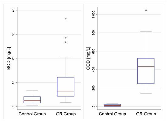 For pH and conductivity (Table 3) the GR group and the control case showed statistically significant differences, in both cases obtaining higher averages for the GR group. Similar results were obtained for organic matter (Figure 8), phosphorus, and coliforms, with concentrations for GRs that were significantly higher than the control cases’ concentrations (Table 3). These are similar to results presented in previous studies, indicating GRs as a source of organic matter [7,46], phosphorus [22,24,25,47,48], pathogens [48], and total dissolved solids [1,30], as well as the pH neutralization effect from GRs [1,22,25,26,31,49,50,51,52].