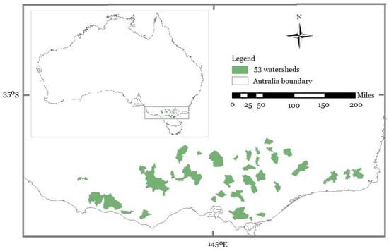 Spatial distribution of 53 watersheds in the southwestern area of Australia.