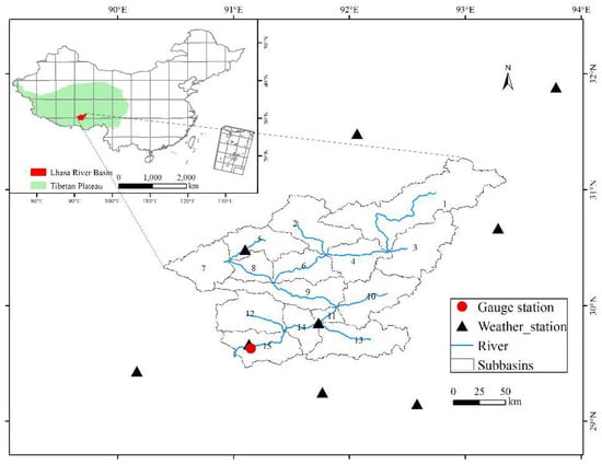 Lhasa River watershed with the geographical locations of the hydrological and meteorological stations in the study area.