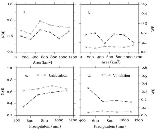 The relationships between NSE/WE and precipitation quantity are explored in Figure 6c,d respectively in order to clarify the ranges of annual precipitation quantity which are appropriate for the utilization of the HIMS model with a semi-arid structure. The watersheds with annual precipitation quantity exceeding 800 mm are more appropriate for the HIMS model as it has better predicting performance for these watersheds with greater NSE and lower WE than the watersheds with precipitation out of this range (Figure 6c,d). For the arid watersheds with precipitation less than 800 mm, the poor model performance of HIMS is possibly attributed to the high nonlinearity and heterogeneity of the rainfall-runoff process in these regions [,,]. The model performance is greater with the increase of size and precipitation quantity within the ranges of the watershed area and annual precipitation (Table 5, Figure 6).