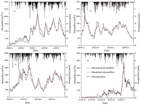Comparisons between simulated and measured streamflow at hourly time step. (a) Strom events simulation in 2000; (b) Strom events simulation in 2001; (c) Strom events simulation in 2003; (d) Strom events simulation in 2010.