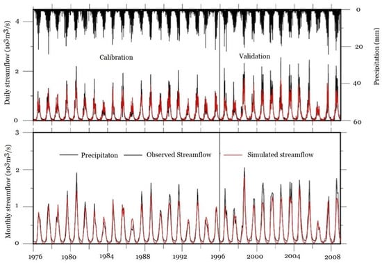 Streamflow comparisons are shown in Figure 8 on the simulated streamflow against observational streamflow at daily and monthly time steps in the periods of model calibration and validation. The peaks of the observed daily and monthly streamflow are not well reached by the simulated values as in reality the streamflow quantity is the target in the calibrating process instead of the peaks of the streamflow at the daily and monthly time steps based on the model function. The evaluating parameters are statistically satisfied with NSEs exceeding 0.80 and WEs within ±10% at the daily and monthly time steps in the calibration period and WE within ±20% in the validation period (Table 7). The simulated monthly streamflow is a summary of the daily streamflow for each month, therefore, it is reasonable that the NSE is higher and the WE is lower for the monthly streamflow than that at the daily step. Another two statistical parameters are calculated as well for model performance evaluation: RSR and PBIAS recommended by Moriasi et al. []. RSR is less than 0.6 and PBIAS is within the range of ±25%, therefore, the model performance in the streamflow estimation is satisfied at both daily and monthly time steps.