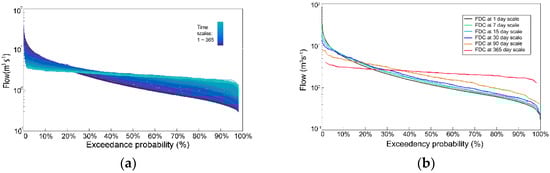Empirical flow duration curve (FDC) variations with time scales for a randomly selected catchment. (a) Time scales from 1 day to 365 days. (b) Time scales at 1, 7, 15, 30, 90, and 365 days.