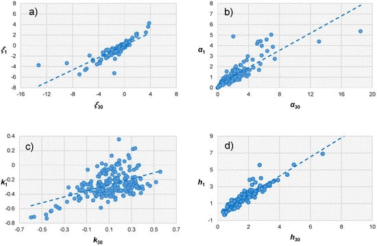 Scatter plots of four parameters at time scales 1 day and 30 day; (a) parameter ξ; (b); parameter α; (c) paramter k; (d) parameter h.