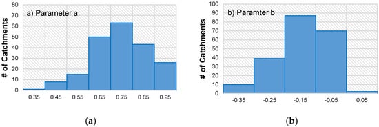 For each catchment, the parameter a and b are estimated and shown in Figure 6. The parameter a for all the catchments is positive and less than 1. This is due to the fact that the ratio is less than 1 for medium and has high exceedance probability. Despite for only two catchments, the parameter b for the rest of the catchments is negative; this is simply because the ratio curve is decreasing overall.