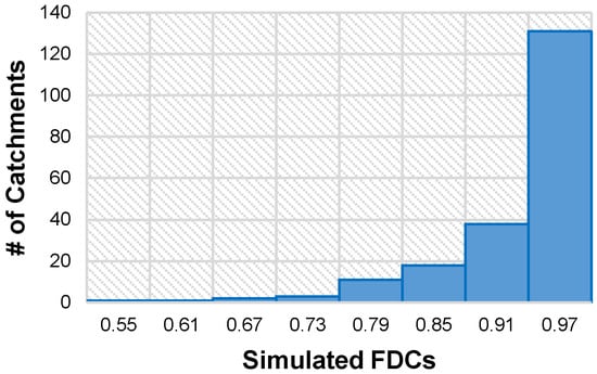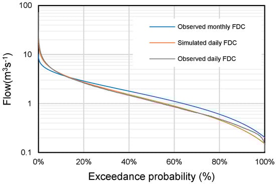 The flow duration curve (FDC), which illustrates the percentage of time with which daily, monthly or some other time interval flows are equaled or exceeded over a historical period for a particular river basin, is recognized as one of the most important and widely used signatures of catchment runoff response []. The FDC is often interpreted as the complement of the cumulative distribution function of the flow, which provides a graphical representation of the relationship between the frequency and magnitude of flows, making it a compact signature of a catchment’s functioning [,].