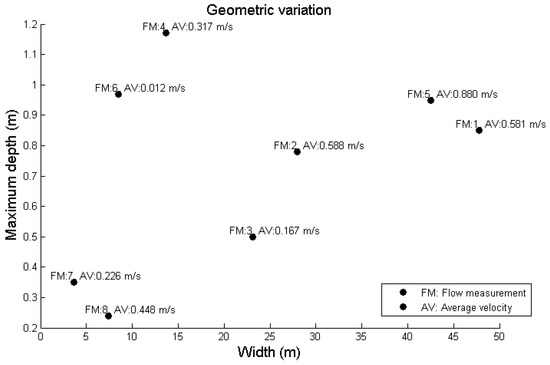 Field records were obtained according to the recommendations of the USGS [4]. A flow measurement selection criterion consisting of shallow rivers with depths of less than 1.6 m was established. Eight flow measurements were carried out with 26 verticals per gauging point. The geometry of each section and associated vertical was recorded. Then the instantaneous velocity for each second of measurement was recorded over a total time of 120 s. Therefore, a sample with 120 random instantaneous velocity records was obtained for each velocity measurement point, which allowed for the sample size to be considered wide, representative, and sufficient for obtaining random values for use with the GLUE method.