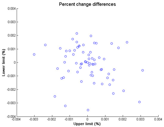 A Valeport 801 electromagnetic flow meter was used for the velocity field measurements. This device has a precision of ±0.5%. Electromagnetic meters are suitable for point velocity measurements and have the advantage of having no moving parts, which eliminates uncertainty due to friction and resistance [12]. To analyze the effect of instrument precision on the calculation of the uncertainty bands, an error factor that varied randomly within the precision range of the device (between 0.995 and 1.005, which corresponds to an instrumental error of ±0.5%) was used. Each velocity value used in the calculation of the uncertainty bands was multiplied by a randomly chosen error factor with uniform distribution within the precision range. Then, in order to analyze the influence of the instrumental error on the uncertainty bands, the percent change values of the upper and lower uncertainty bands for each gauge were compared. The results for Gauge 1 are shown in Figure 4.