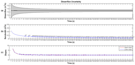 To define the optimal point VMT, two criteria were used in which one is based on the uncertainty bandwidth variation over time and another is based on the stability of the upper and lower slopes of the uncertainty band. The bandwidth was considered the difference between the upper and lower bounds of the band. This width defines the range of the total streamflow results in m3/s for the different measurement times. To determine the variation of the uncertainty bandwidth, the percent difference was calculated every second (Equation (1)) where Hi is the bandwidth value at a given time i.