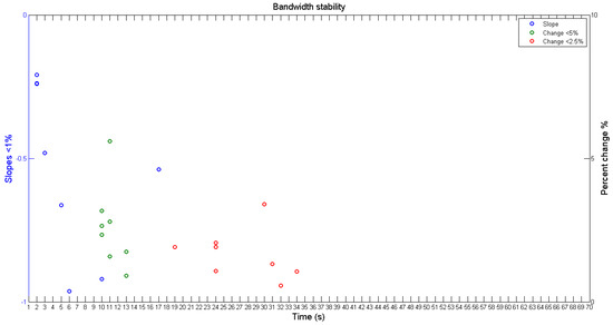 Figure 6 shows the results obtained for the eight gauging points, which indicates the time at which the criteria of the slope of less than 1% (blue circles) and percent change in bandwidth of less than 5% (green circles) are established. As a comparison, a second stability criterion for bandwidth, calculating the time at which percent change is lower than 2.5% (red circles), was added. Based on the results shown in Figure 6, an optimal time of 17 s is obtained using the less than 5% bandwidth change criterion while 34 s is the optimal time when a 2.5% change is considered.