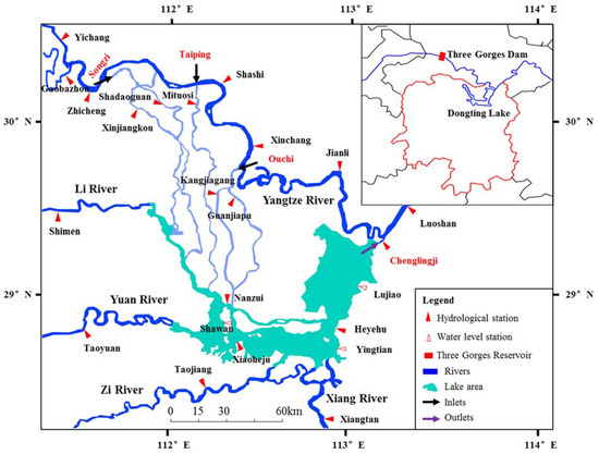 Dongting Lake, which is located in the middle Yangtze River (111°19′–113°34′ E, 27°39′–29°51′ N), is one of the famous freshwater lakes in the world (Figure 1). The lake area is approximately 2579 km2, accounting for 0.143% of the entire Yangtze basin. The river network around the lake area is the important hydraulic connection between the Dongting Lake and the Yangtze River. Flow diversion occurs from the mainstream of the Yangtze River to the Dongting Lake through the tributaries distributed between the both. There are three flow inlets along the mainstream, as shown in Figure 1, Songzi, Taiping and Ouchi. In addition, four rivers (Li River, Yuan River, Zi River, and Xiang River) pour their water into the Dongting Lake. The flow outlet of the Dongting Lake, Chenglingji, is located at the lowest site of the lake area. All of the rivers and the lake constitute a complex river-lake system in the middle Yangtze River. There are some gauging stations in the study area, which monitored the water level and discharge processes at the key channel sites (Figure 1). The detailed information for these stations is listed in Table 1.