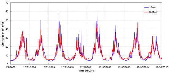 The TGR is located at approximately 45 km upstream of the Yichang hydrological station. Its length and height are 2309 m and 185 m, respectively. According to the operation rules of the TGR, there are four continuous periods of flow regulation within a complete run cycle: (1) flood pre-discharged control, the water in the reservoir is emptied to the downstream before the main flood seasons [28,29]; (2) flood regulation, the upstream floods are regulated and then discharged to the downstream during the periods from July to August [30]; (3) reservoir impoundment, the TGR begins to store water during the approximate periods from September to October; and (4) water compensation, the outflow from the TGR is increased in order to meet the downstream water demand during the dry seasons. The water compensation generally occurred from December to the following April to meet the industrial and agricultural needs and maintain the water depth in the downstream waterways. The TGR was put into operation in 2003 and its impoundment test lasted five years. Impoundment test of the normal pool level was conducted in 2008, and the normal flow regulation of the TGR began since 2009. The inflow and outflow processes of the TGR from 2008 to 2015 are shown in Figure 2. There were the similar regulated flow progresses because of the same strict scheduling rules of the TGR.