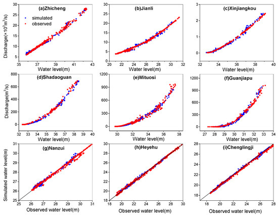 The NSE and RMSE were computed and are shown in Table 3. The NSE at the most gauging stations was larger than 0.9 and RMSE was small enough, which indicated the coupled model could predict and evaluate the hydrological changes accurately after the TGR operation in the study area. The calibration and validation results of the coupled model based on the observed data in 2008 and 2011 show that there is a good agreement between the simulated and observed data at the Dongting river-lake system. The two important evaluation indicators, the NSE and RMSE, indicate that the coupled model can predict and evaluate the hydrological changes accurately after the operation of the TGR in the study area.