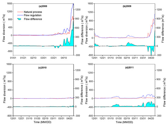 The flow regulation of the TGR greatly changed the downstream hydrological processes (Figure 2). The peak discharge was significantly reduced, while the low-flow discharge was compensated to some extent in the mainstream after the TGR operation. Therefore, there was an unavoidable impact on the water exchange in the river-lake system during the dry seasons (from the December to the following April). The processes of total flow diversion through the three inlets (Songzi, Taiping, and Ouchi) are shown in Figure 4 based on the computed results. However, there was no drastic flow increase at these inlets during the most time of water compensation. The largest flow increase generally occurred in April because of the beginning of flood pre-discharge control in the late April. The mean flow diversion during the four dry seasons from 2008 to 2011 was about 84.7 m3/s and 56.7 m3/s with and without the TGR, and the mean flow increase was approximately 28 m3/s after the TGR operation.