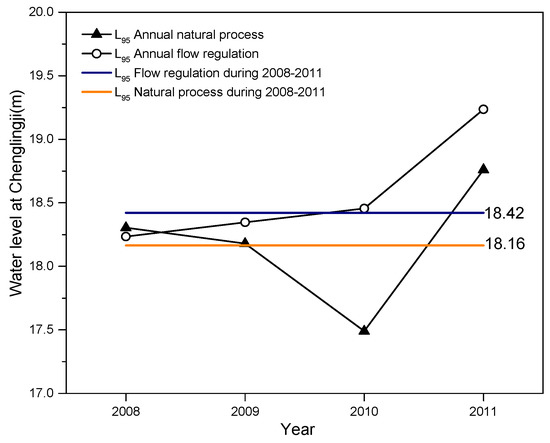 The Chenglingji station was located in the lowest site of the Dongting Lake, which gauged the flow processes from the lake area to the mainstream. Therefore, the variation in the low water level at the Chenglingji station can reveal, to some extent, the discharging and impounding results of the Dongting Lake. In order to describe the changes in the low water level at the Chenglingji station, the water level L95, with the exceedance frequency of 95%, was selected as a characteristic parameter to show the stage changes during the dry seasons. The variation in the L95 at the Chenglingji with and without the TGR from 2008 to 2011 is shown in Figure 7. The annual characteristic parameter L95 under the operation of the TGR was obviously larger than the one without the TGR, except for 2008. The characteristic parameter L95 under the TGR regulation from 2008 to 2011 was 18.42 m, which was 0.26 m higher than the one without the TGR.