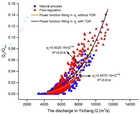 The water exchange between the mainstream and the Dongting Lake is an important hydrological process to keep the balance of the river-lake system. The flow increase in the mainstream during the period of water compensation from the TGR changed the hydraulic interaction, and finally reached a new balance in the system. Figure 9 presents the relationship between the coefficient of water exchange and the outflow from the TGR. As shown in the Figure 9, there is a good agreement between the coefficient of water exchange and outflow from the TGR, which indicates that the outflow from the TGR has a direct influence on the water exchange between the mainstream and the Dongting Lake. With the increase in the outflow from the TGR, the coefficient of water exchange increases in the form of a power function. Therefore, the outflow increase of the TGR resulted in the variation in the water exchange between the mainstream and the Dongting Lake, which contributed to relieving the extreme drought to some extent.