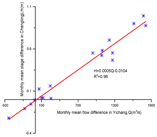 The outflow from the TGR increased during the water compensation from December to the following April, which changed the hydraulic interaction between the rivers and the lake area. Therefore, the changed hydraulic interaction may lead to some variations in the water level along the channels. The relationship between the flow difference at the Yichang station and the water level difference at the Chenglingji station with and without the TGR is shown in Figure 10. With the increase of flow difference, there is an obvious linear increase in the water level difference. When compared with the unregulated flow, there will be an increase about 0.49 m in the water level at the Chenglingji station when the flow increase is up to 1000 m3/s during the dry seasons. The water level at the lowest outlet of the Dongting Lake reflects the magnitude of lake volume. Therefore, the volume change in the lake area was the response to the variation in the hydraulic interaction of the river-lake system.