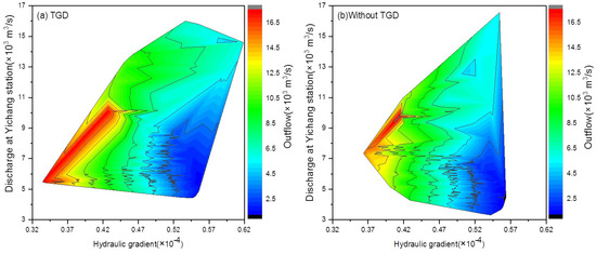 In fact, the stage changes in the lake area were closely related to the inflow and outflow of the Dongting Lake [41]. Figure 11 presents the relationship between the outflow at the Chenglingji station and the hydraulic gradient and discharge at the Yichang station. The increase in flow discharge at the Yichang station made nearly no difference to the outflow of the Dongting Lake when the hydraulic gradient was between 0.000043~0.000048. While the hydraulic gradient was smaller than 0.000043 or larger than 0.000048, the outflow increased greatly with the flow increase at the Yichang station. However, the hydraulic gradient played an important role in the whole changing processes of outflow. The outflow variation directly resulted in the changes of water level and water volume in the Dongting Lake. Therefore, in order to contribute to the ecological restoration and environmental improvement in the river-lake system, much more attention should be paid to the hydraulic gradient variation, which greatly affects the hydraulic interaction between the rivers and the Dongting Lake. When there is a constant outflow from the TGR, i.e., the discharge at the Yichang station is kept the same, the outflow from the Dongting Lake to the Yangtze River can be adjusted by the hydraulic gradient to some extent. Consequently, a reasonable hydraulic gradient definitely contributes to the improvement of water volume of the Dongting Lake during the extremely dry seasons.