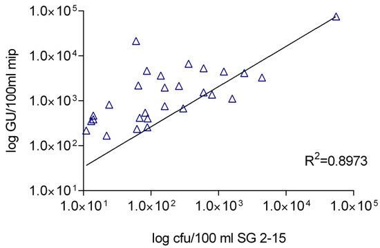 Comparison of L. pneumophila sg2–15 culture and qPCR results (mip gene) for 83 water samples: Only pairs of results with values positive both in culture and qPCR are shown and used for calculation of the correlation coefficient (n = 28). The R2 value of 0.8973 indicates a correlation between culture and qPCR.