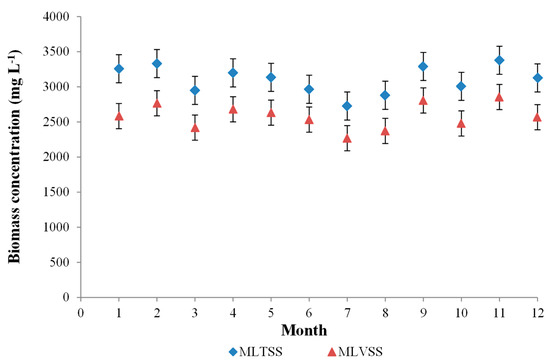 Figure 2. Evolution of mixed liquor total suspended solids (MLTSS) and mixed liquor volatile suspended solids (MLVSS).