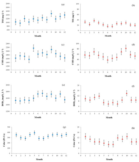 Figure 3. Evolution of total suspended solids (TSS), chemical oxygen demand (COD), seven-day biochemical oxygen demand (BOD5) and color for the influent and effluent of the paper mill wastewater treatment plant. (a) TSS of the influent. (b) TSS of the effluent. (c) COD of the influent. (d) COD of the effluent. (e) BOD5 of the influent. (f) BOD5 of the effluent. (g) Color of the influent. (h) Color of the effluent.