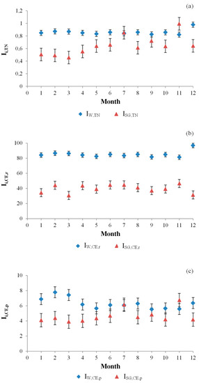 Figure 5. Evolution of indicators of technological nutrient performance (Ii,TN) and indicators of circular economy efficiency (Ii,CE,r and Ii,CE,p). (a) Indicators of technological nutrient performance for water (IW,TN) and for sludge (ISG,TN), (b) reductive indicators of circular economy efficiency for water (IW,CE,r) and for sludge (ISG,CE,r), (c) productive indicators of circular economy efficiency for water (IW,CE,p) and for sludge (ISG,CE,p).