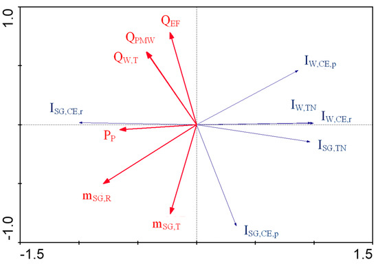 Figure 6. Triplot diagram for redundancy analysis of the indicators of technological nutrient (Ii,TN) and circular economy (Ii,CE,r and Ii,CE,p) in relation to the operational variables QEF (volumetric flow of treated water that can be recovered during the treatment process), QPMW (volumetric flow of wastewater from the paper mill), QW,T (total water volumetric flow consumed in the paper production process), PP (mass flow of paper produced), mSG,R (mass flow of recovered sludge during the wastewater treatment of the paper mill) and mSG,T (mass flow of generated sludge).