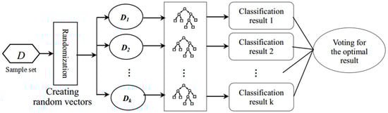 Suitable weights greatly improve the accuracy and quality of landslide susceptibility assessment. This study utilized a random forest (RF) to determine the index weight. An RF is a classifier consisting of a collection of tree-structured classifiers , where are independent, identically distributed random vectors, and each decision tree (DT) casts a unit vote for the most popular class at input x [55]. Multiple samples are drawn in a RF utilizing the resampling bootstrap method, and classification and regression trees (CARTs) are built corresponding to each bootstrap sample (Figure 1).