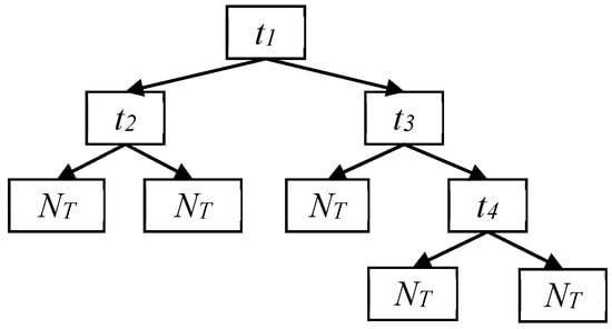 Classification and regression trees (CARTs) (Figure 2), consist of root node (t1), internal node (ti, i = 1, 2, 3 and 4) and leaf node (NT). The root node is split into two internal nodes according to a certain split standard when the tree begins to grow. The internal node then becomes root node and is split again and the splitting process repeats constantly until the terminal leaf node generates. If there are M input variables (i.e., susceptibility indices in this study), a number m << M is specified so that, at each node, m variables are selected at random out of M, and the best split of these m is applied to split the node. The value of m remains constant during the forest’s growth. The minimum Gini value is the split standard of the node, with the corresponding variable considered as the optimal variable. The Gini value is calculated as follows: