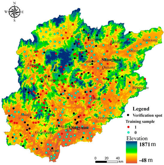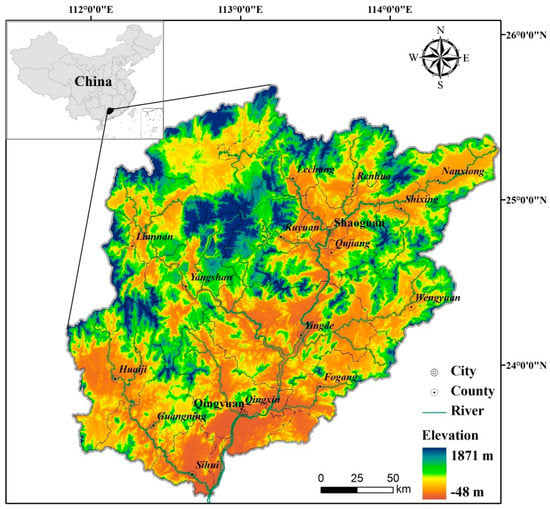 The Beijiang River is the second largest river in the Pearl River system located in the Guangdong Province, China [67], and is approximately 582 km long with a drainage area of 46,649 km2 (Figure 3). The Beijiang River Basin predominantly constitutes two cities and sixteen counties and features a subtropical monsoon climate with a multi-year average precipitation of 1800 mm. The flood season of the basin is from April to September, and the dry season is from October to March of the next year [68]. Approximately 70–80% of the annual rainfall is concentrated in the flood season with the rainfall fastigium from May to July [69]. Main soil type of the basin is red soil, typical to hilly topographical areas of south China, and converted to a soft soil once infiltrated by rain. Geological structure of the basin includes 68 lithology types and a substantial number of small faults in the middle and upper reaches, composing a complicated and adverse geological environment with potential for geological instability [70]. The characteristics of high-intensity rainfall, poor agrotype, complicated landform, and complicated and adverse geological environment in the basin can lead to a high probability of landslide hazard. Examples of occurrences in the area include a serious landslide in Qingxin County resulting from continuously heavy rain in March 2012, causing 7 deaths and 1 injury; four people of Nanxiong County were buried by a rainstorm-triggered landslide in May 2013; a landslide in Huaiji County caused by continuous heavy rain then killed 2 villagers and injured 3 children in May 2014; etc. The accidents suggest the Beijiang River Basin is facing great challenges in prevention and reduction of landslides. Taken together, the studied area is considered as a typical case for landslide susceptibility assessment.