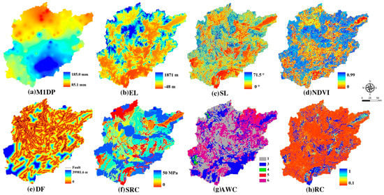 Spatial distribution characteristics of the eight susceptibility indices. Note: M1DP—maximum one-day precipitation; EL—elevation; SL—slope angle; NDVI—normalized difference vegetation index; DF—distance to fault; SRC—shear resistance capacity; AWC—available water storage capacity; RC—runoff coefficient.
