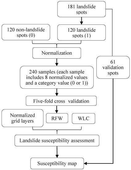 Normalized grid layers and the weight were then input into Equation (1) utilizing the raster calculator of GIS to calculate landslide susceptibility value and generate a susceptibility map. The landslide susceptibility map was classified into five susceptibility levels―very high, high, moderate, low and very low—by the quantile method as contained by an equal number of features. The flow chart of the assessment is shown in Figure 6.