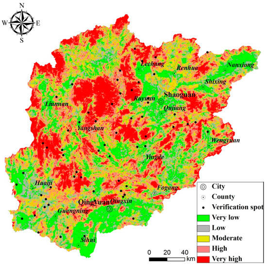 Landslide susceptibility map based on RFW in the Beijiang River Basin.