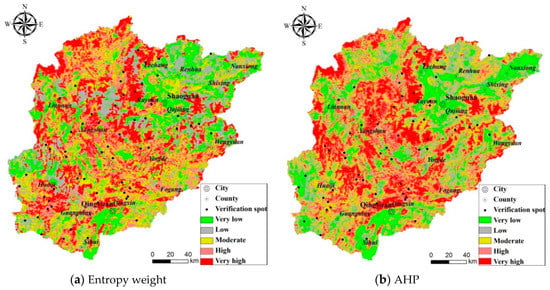 Landslide susceptibility maps based on entropy weight and weight determined by AHP.