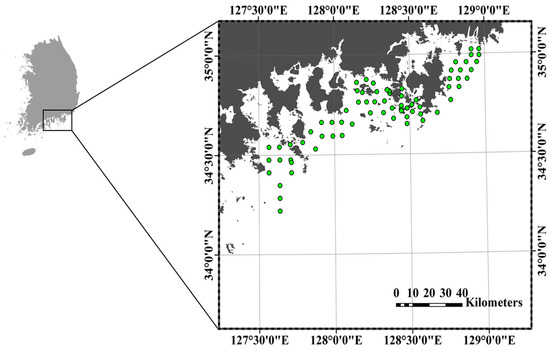 The research area in this study is the middle of the South Sea of Korea (Figure 1). The area extends from 34°00′ N–35°30′ N and 127°00′ E–129°30′ E. This area could be characterized as a complex coastline with many aquaculture farms, influenced by an oceanic current; i.e., the Tsushima Current. The Tsushima Current is a branch of the Kuroshio Current and transports high levels of nutritious warm water to the South Sea of Korea [26,27]. The first bloom event of C. polykrikoides was recorded during the early 1980s at a semi-enclosed bay; i.e., Jinhae Bay. Since the 1980s, many coastal areas in the South Sea of Korea have been affected by C. polykrikoides blooms [28,29,30].
