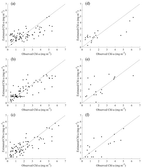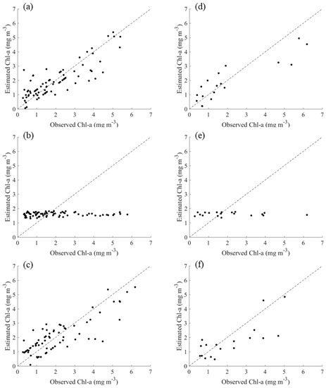 Scatter plots of in situ and estimated chl-a for the SVR model using the Gaussian radius bias kernel. (a) the training results for the four-band, (d) the validation results for the four-band, (b) the training results for the four-band-ratio, (e) the validation results for the four-band-ratio, (c) the training results for mixed dataset (f) the validation results for mixed dataset.