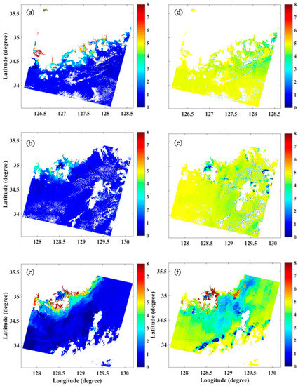 In addition, distribution maps of chl-a, created using machine learning models, are shown in Figure 6. From the raw Landsat-8 image, the ANN and SVR models were applied and chl-a maps were developed. For the raw images, a total of three images, 3 August, 12 August, and 13 September 2017, were used. To avoid an overfitting problem, the models that had the lowest difference between the training and validation performance was selected. The four-band-ratio and four-band datasets were chosen for the ANN and SVR models, respectively. In the ANN model case, for (a), (b) and (c), the trends in the coastal areas have a relatively high chl-a concentration and open ocean has under 2 mg m−3 appeared, generally. However, the four-band SVR model showed poor distribution performance. There was no remarkable difference between the coastal and open ocean areas. In the case of 13 September 2017, a high concentration distribution appeared but there was also more than 4 mg m−3 in the open ocean area.