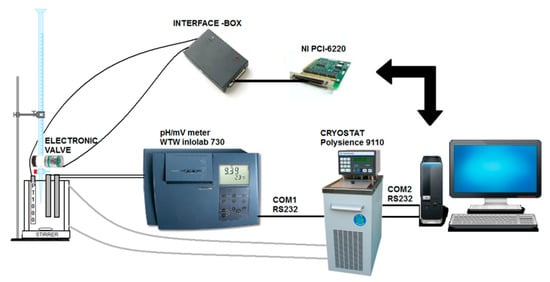 The computer was extended with a multifunction NI PCI-6220-DAQ board, a homemade power supply interface box and the National Instruments Software Platform Bundle Spring 2016 (NI corp.) [8]. A temperature sensor, PT1000 (Schott type W 5780 NN supplied by VWR International, Oud-Heverlee, Belgium) to measure the temperature of the solution in the vessel (Figure S3) was connected via DAQ built into a HP Compaq Elite 8300 Micro tower working with the operating system Microsoft Windows 10. The temperature of the water in the cryostat, connected via a RS 232 interface port, and thus, also of solution in the insulated titration vessel, was automatically set to 298 K. The temperature was monitored to allow the cryostat to respond to the least temperature change.