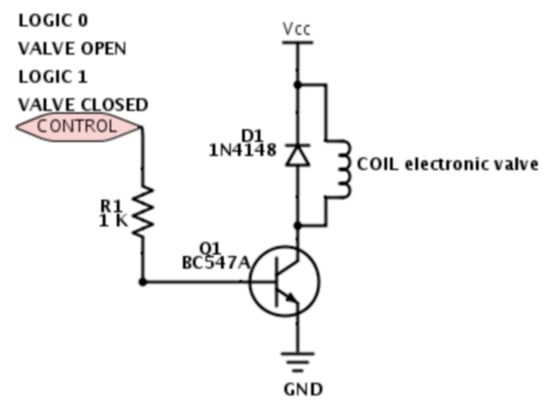 The solenoid diaphragm valve has a function ‘Normal Open’ to fill the burette with the titrant reagent. To close the valve, the controlling electronic power supply circuit of the homemade interface box (Figure 3) provides 12 V DC across the solenoid (COIL).