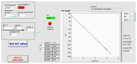 In Scheme 1, the methodology is outlined. In Part I of the experimental procedure, a calibration of the droplet volume was performed by the homemade LabVIEW program controlling the normally open valve connected to the burette. The valve opens and closes automatically five times while the AgNO3 solution is dripping out. The volume poured out was read from the burette, and the program calculated the mean droplet volume from a triplicate measurement. In Part II of the experimental procedure, the linear regression line (Nernst equation) E(Ag+) versus –log c(Ag+) was constructed via the modelling LabVIEW tool, starting from the mV-measurements of five different, thermostatically controlled (298 K) standard AgNO3 solutions adjusted with ISA (1 volume ISA/50 volumes ionic solution) (Figure 4). The Ag+ activity of a series of AgNO3 solutions in the homemade double walled vessel was measured via the Ag/S2− electrode.