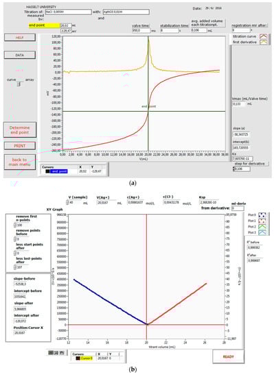 The titration curves, E (mV) versus V(AgNO3) (mL), of the titration of an unknown NaCl solution and fresh river water, respectively (Figure 5a and Figure 6a) provide information on the end point derived by the numerical first derivative method, the VI tool within the LabVIEW software, as well as by the Gran plot equations in the tailor-made LabVIEW program (Table 1 and Table 2). The VI method is limited due to the numerical character of the derivatives leading to one single titration end point: The slightest deviation in the potential, E, at the end point of the titration has a dramatic impact on the value of Ksp. The Gran plot strategy is not subject to this drawback because of the use of a range of experimental titration data near by the end point.